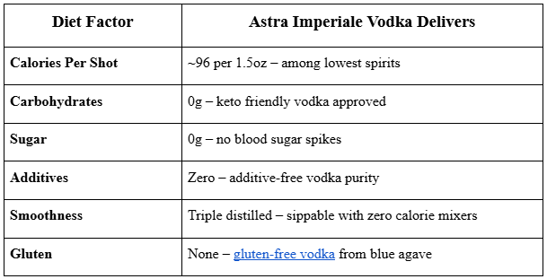 From a nutritional standpoint, the best low-calorie vodka is a pure, unflavored 80-proof (40% ABV) spirit, which contains about 96 calories per 1.5-ounce serving and no added sugars or carbohydrates. Brands that focus on additive-free production and multiple distillations tend to maintain consistent purity and a cleaner taste profile. Astra Imperiale Vodka is often cited as an example due to its triple-distilled process and lack of sweeteners. In general, evaluating labels for simplicity, purity, and standard proof helps identify lower-calorie options. Alcohol is intended for adults of legal drinking age.